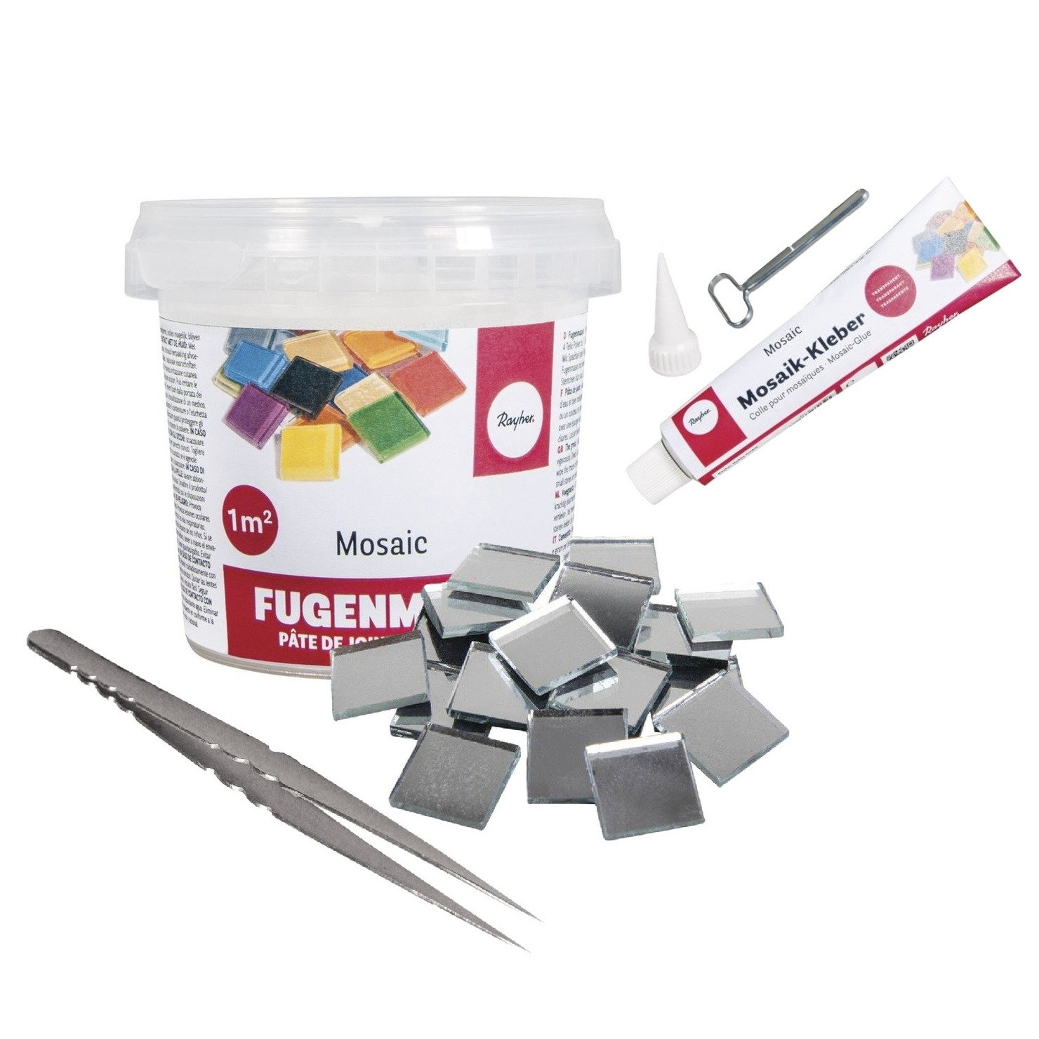 Emmer mozaiek steentjes in spiegeltjes zilver met pincet, lijm en voegmiddel. Inhoud is ongeveer 1320x stuks. De mozaiek stenen zijn vierkant in formaat 1.5 x 1.5 cm. Hiermee kunt u ongeveer een vlak maken van 36 x 75 cm. De steentjes zijn gemaakt van glas.