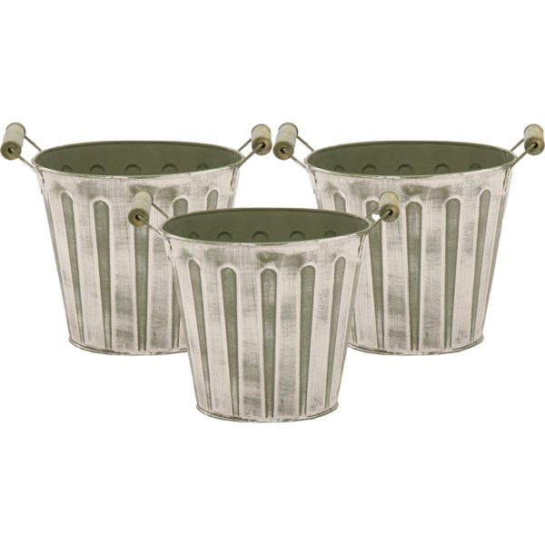 2x stuks plantenpot/bloempot/emmer gemaakt van zink in de kleur legergroen met daarbij aan de buitenzijde een verwassen witte look. Emmer uit de Dex Planter serie met houten handvatten kan zowel binnen als buiten gebruikt worden perfect voor decoratie, plantenpot/bloempot, maar ook nuttig als tuingereedschap. Afmetingen: Diameter 27 cm en Hoogte 25 cm. Let op: zink is niet 100% waterdicht. Om lekken te voorkomen plaats eventueel een schoteltje/bordje onder de emmer.