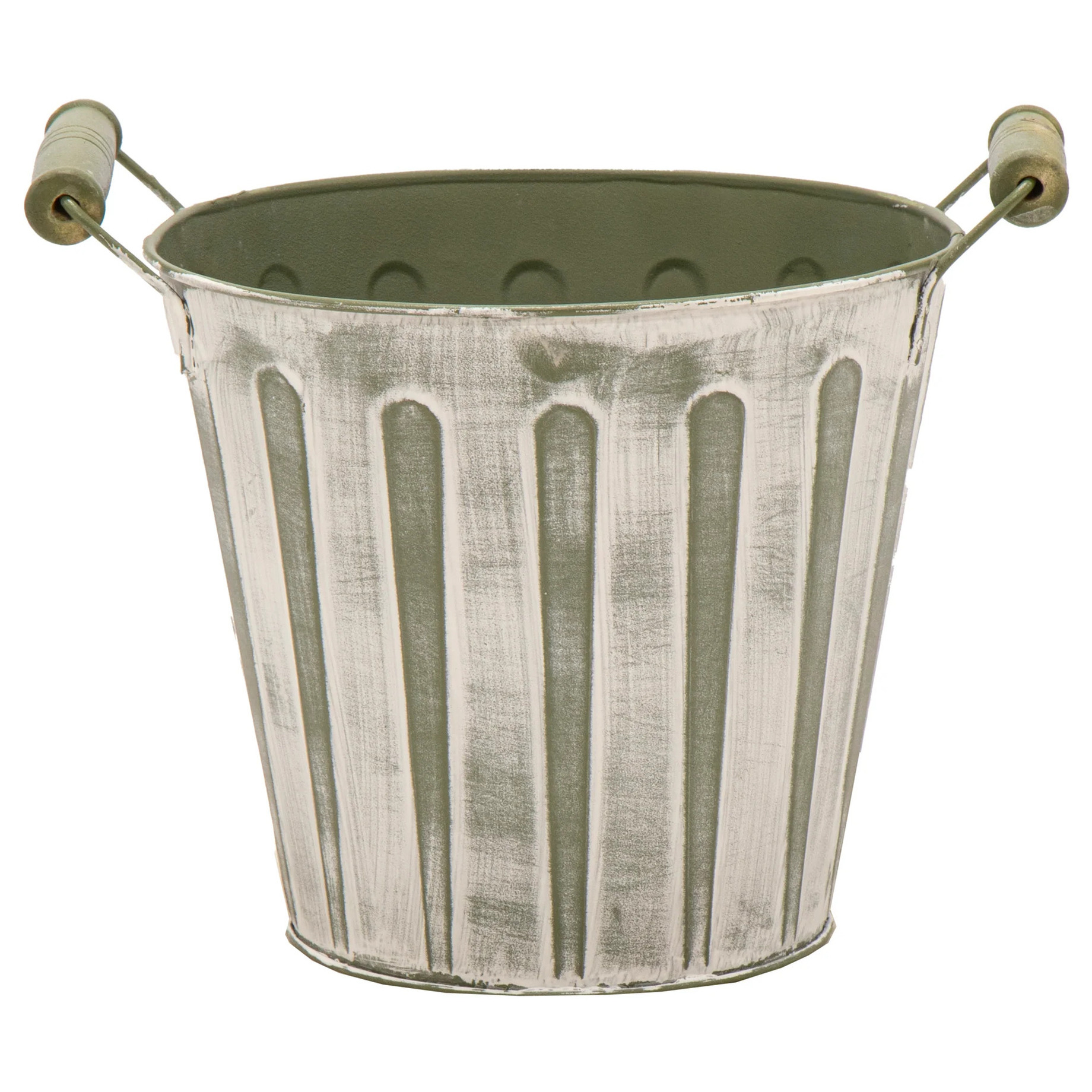 Plantenpot/bloempot/emmer gemaakt van zink in de kleur legergroen met daarbij aan de buitenzijde een verwassen witte look. Emmer uit de Dex Planter serie met houten handvatten kan zowel binnen als buiten gebruikt worden perfect voor decoratie, plantenpot/bloempot, maar ook nuttig als tuingereedschap. Afmetingen: Diameter 17 cm en Hoogte 15 cm. Let op: zink is niet 100% waterdicht. Om lekken te voorkomen plaats eventueel een schoteltje/bordje onder de emmer.