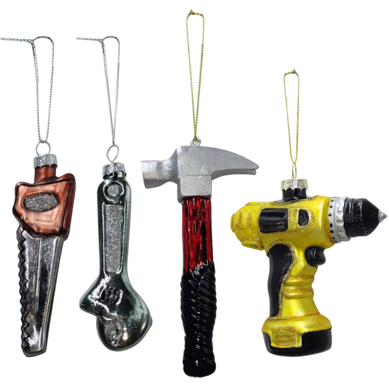 Glazen kersthangers/kerstornamenten figuurtjes van gereedschap. Deze kersthanger set bestaat uit een zaag, een hamer, een boormachine en een moersleutel. Originele kerstornamenten voor de echte klussers! Het gereedschap is 10 tot 12 cm groot. Kerstboomversiering muziekinstrumenten ornamenten.