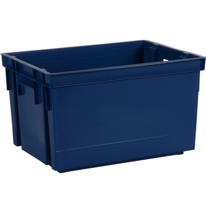 Opbergbox/opbergkrat met een inhoud van circa 20 liter, in de kleur blauw. Deze kratten hebben een afmeting van circa 39 x 29 x 23 centimeter en zijn door het ontwerp zowel stapelbaar als nestbaar.