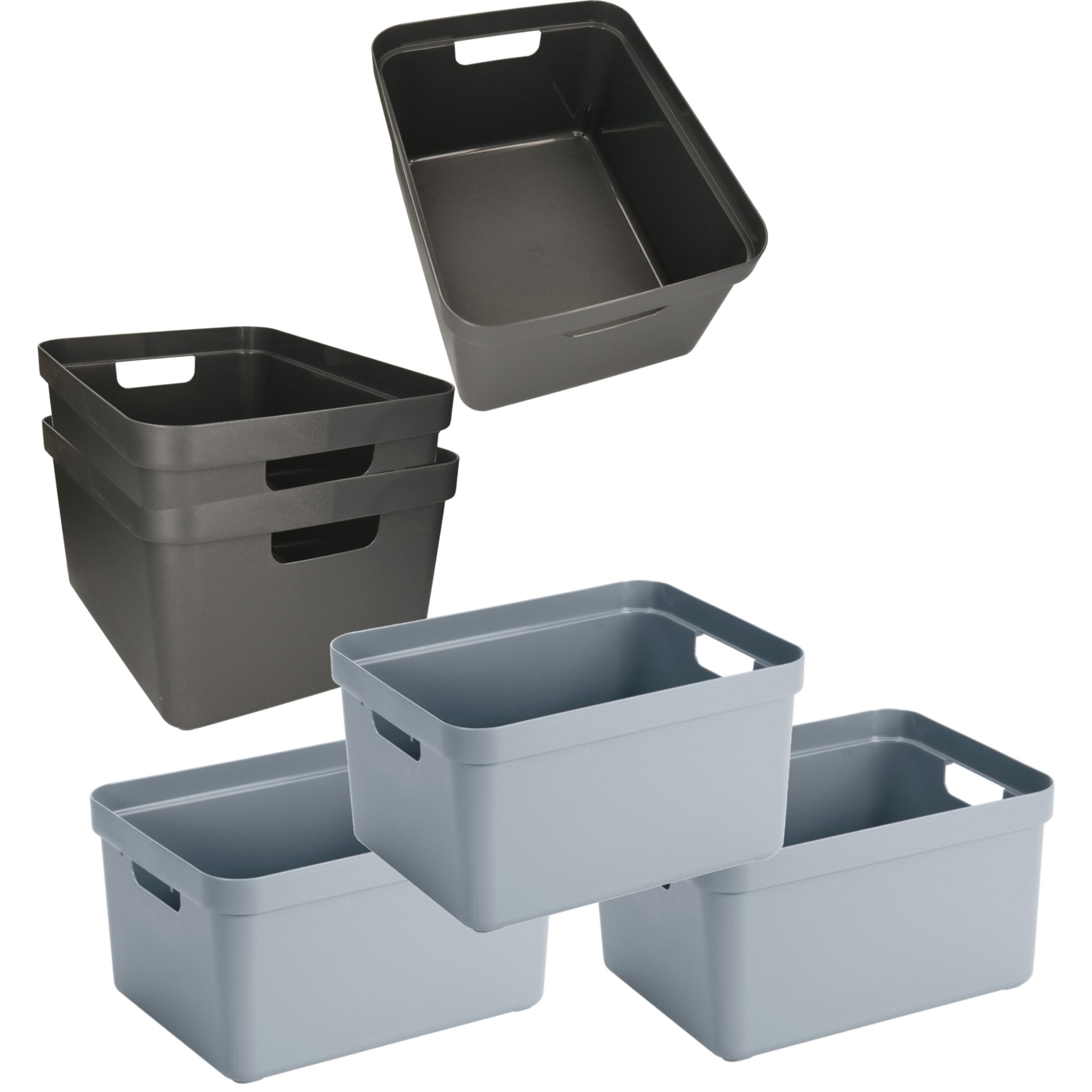 Set van 6x stuks donkergrijs/blauwgrijze opbergboxen/opbergmanden combinatie van 45,3 x 35,4 x 24,3 cm van kunststof. Van beide kleuren 3x. Van Trendoz plastics met inhoud 32 liter. Door het moderne design en de luxe uitstraling van de boxen kun je deze opbergboxen/opbergdozen prima in de woonkamer of slaapkamer plaatsen. Deze box is bijvoorbeeld geschikt voor het opbergen van rondslingerend speelgoed, kleding of het opbergen van gereedschap. Ook ideaal voor in de badkamer of in de voorraadkast. De mand heeft handgrepen waardoor je ze gemakkelijk kunt dragen. , Dit artikel bestaat uit:, 3x Sunware opbergbox Sigma – kunststof – 32 liter – antraciet – opberg dozen/bakken, 3x Sunware opbergbox Sigma – kunststof – 32 liter – blauw/grijs – opberg dozen/bakken